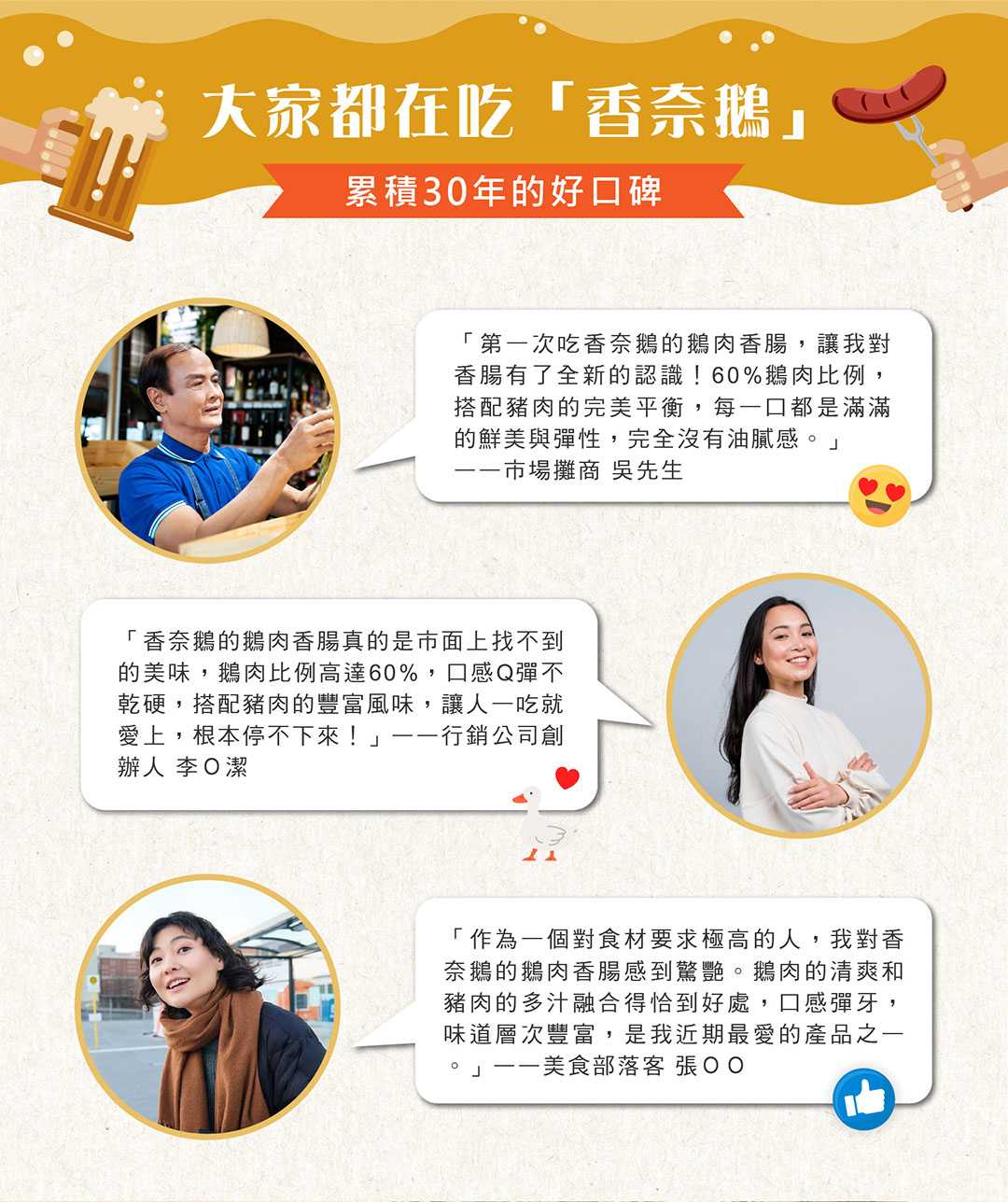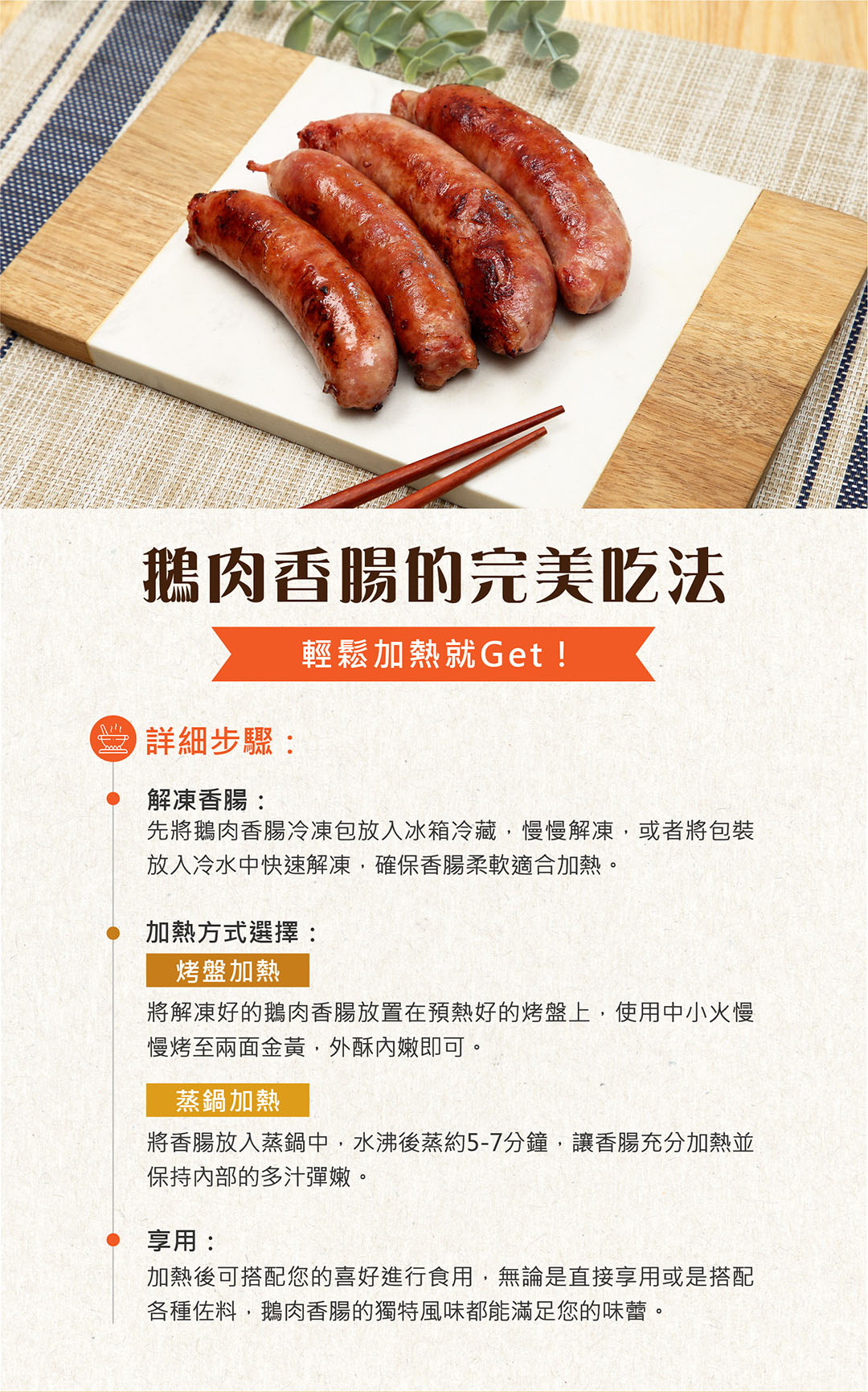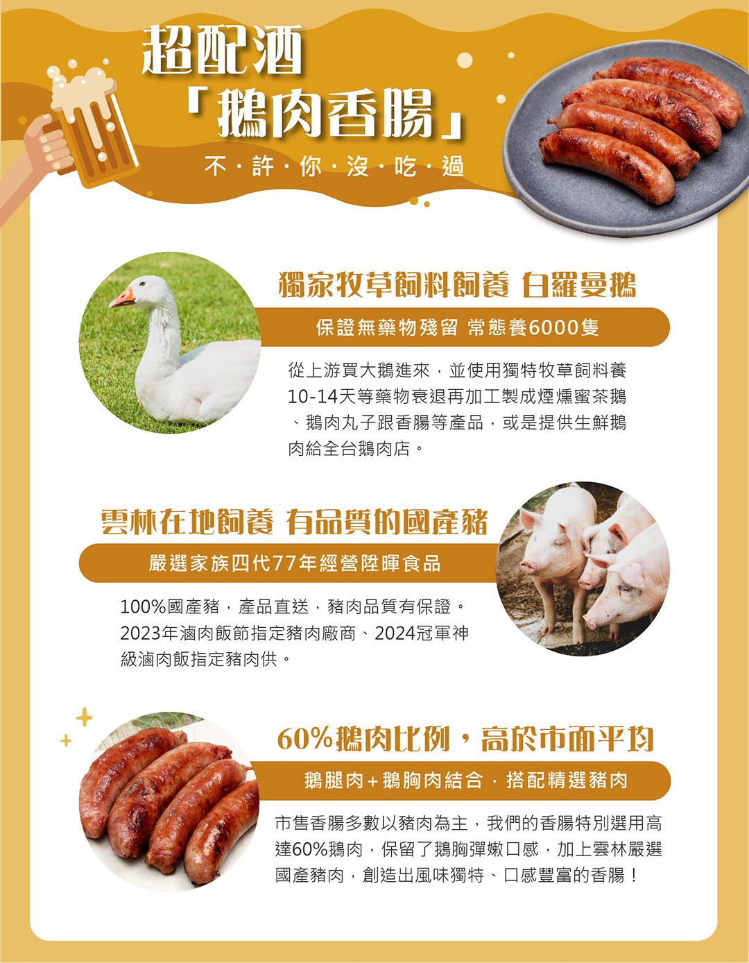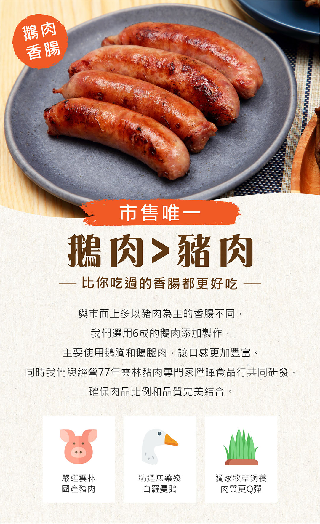 在製作鵝肉香腸時,會產生部分長度略短、外型不夠工整,或使用邊角料製作的香腸,雖然外觀稍有不同,但仍然是嚴選 白羅曼鵝與雲林在地經營77年的豬肉屠宰廠陞煇食品豬肉 製成,風味與口感無異。與其浪費這些仍然美味的香腸,我們選擇推出 惜食價,讓這些資源被善用,減少浪費、吃得更有意義!每一條香腸仍經過嚴格品管,保留煙燻甘甜的層次感,讓惜食也能成為一種美味選擇!